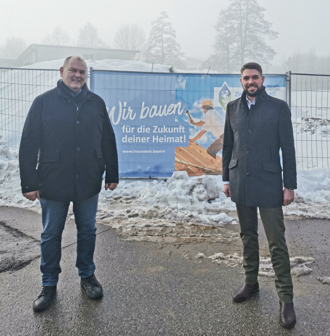 Landrat Siegfried Walch und Betriebsratsvorsitzender des Klinikums Traunstein, Thomas Nicolai, an der Baustelle der Personalwohnungen in Traunstein © Landratsamt Traunstein