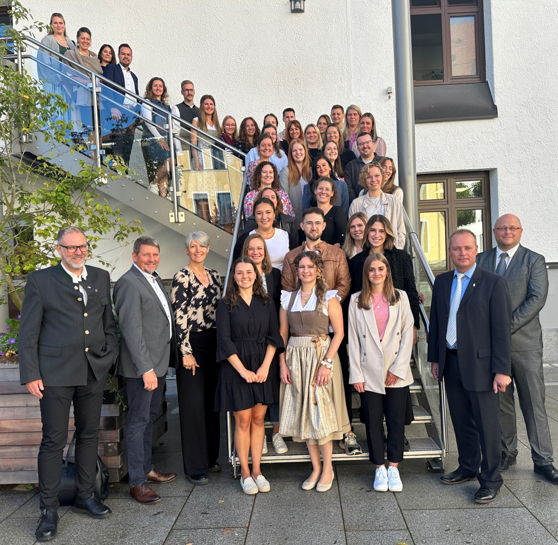 Die 36 neuen Lehramtsanwärterinnen und -anwärter und 3 Lehrkräfte im Anpassungslehrgang des Schulamtsbezirks Traunstein zusammen mit (v.l.) Landrat Andreas Danzer, Vorsitzender des ÖPR Alexander Fietz, Schulrätin Katharina Amberger (4.v.li.) sowie (v.re.) Fachlicher Leiter/Schulamtsdirektor Clemens Gruber und Schulamtsdirektor Michael Stang. ©Landratsamt Traunstein
